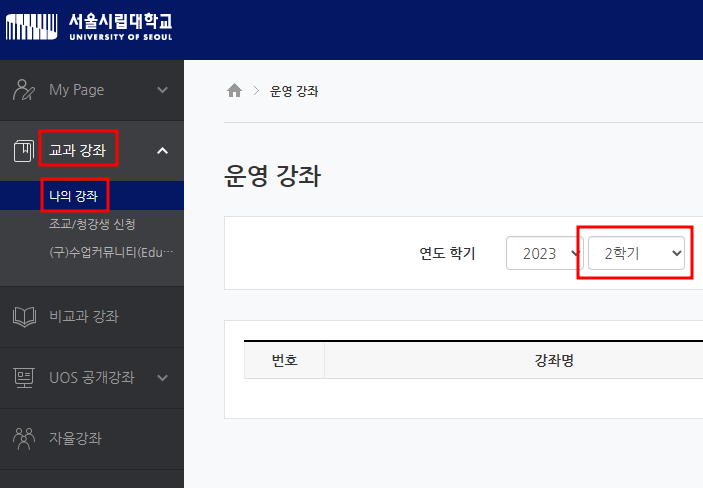 그 이전까지는 온라인강의실 좌측 카테고리 중 '교과 강좌' - '나의 강좌'에서 확인할 수 있습니다.